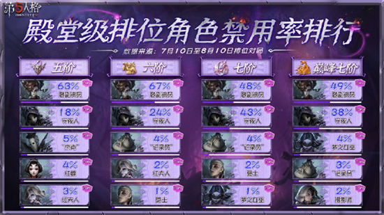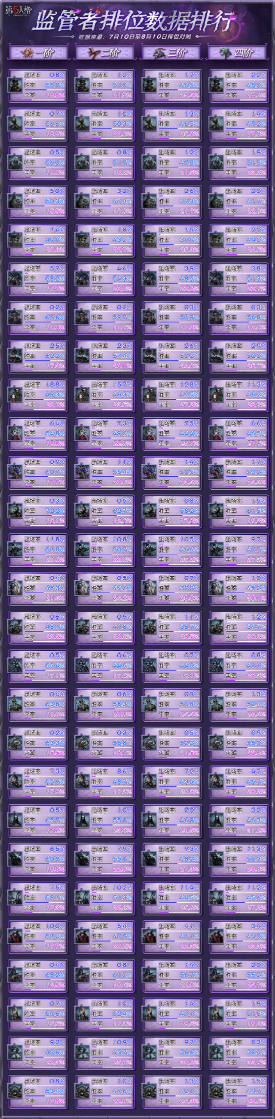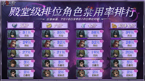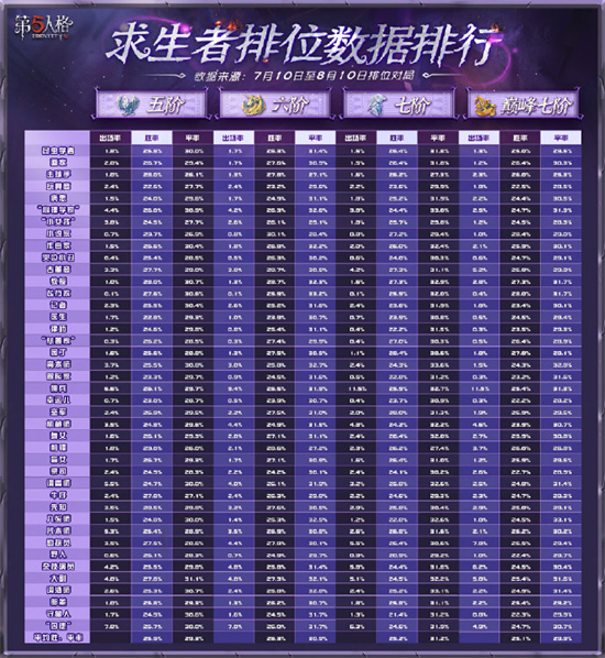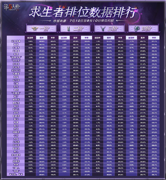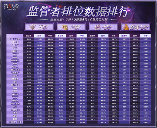 第五人格最新的人物排名怎么样? 第五人格是一款深受全球年轻人喜爱和认可的非对称追逃竞技手游。游戏有着怪异的哥特式主题,每个角色都有着独特的性格。场景、技能特效和人物设定都非常有趣,再加上非常诡异烧脑的剧情,让每一场游戏都极其令人难忘。当然,最重要的是,我们的第五人格手游拥有多种角色,你可以自由选择参与对抗。每个角色的玩法都截然不同,你永远不会感到无聊。近日,游戏官方根据大家的情况,整合了最详细的角色平衡数据。如果你想在后续的战斗中取得优势,就必须仔细阅读下面为你带来的每张数据表。