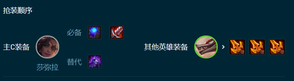 莎莉米拉的蓝buff和血剑是必须带的,剩下的可以根据情况给救生装备,而纳亚菲力给的是死亡之刃,主要作用是附身后的伤害。