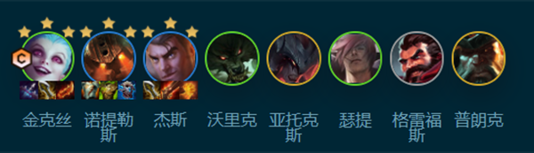 所需棋手:金克斯、鹦鹉螺、杰斯、沃里克、亚托克斯、Seti、格雷夫斯、普朗克