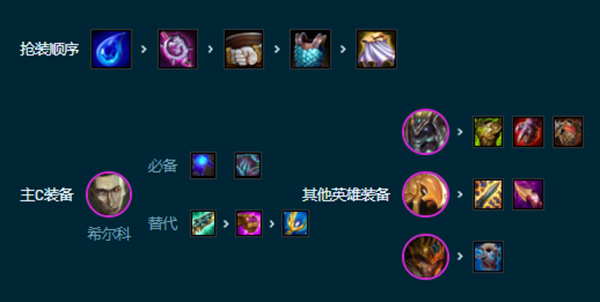 这套奇尔科的鬼书和蓝色buff很重要。剩下的一个最好给科技炮,不给其他输出设备也可以。Ness以肉为主T抗伤,多余装备可以给沙皇当副c