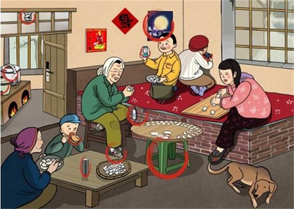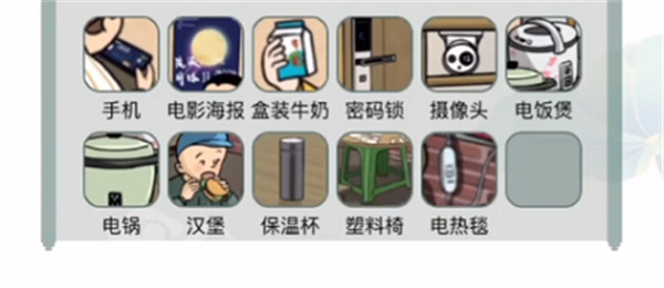 十二个不和谐的地方:手机、电影海报、盒装牛奶、电子锁、相机、电饭煲、电饭锅、汉堡、保温杯、塑料凳、电热毯、鞋子。