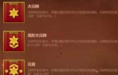 六、元帅级别:大元帅、高级大元帅、国家元首。其中,这个等级不再是根据经验,而是根据荣誉点数。荣誉点越多,军衔越高,军衔会上下波动。