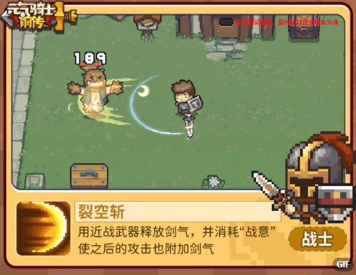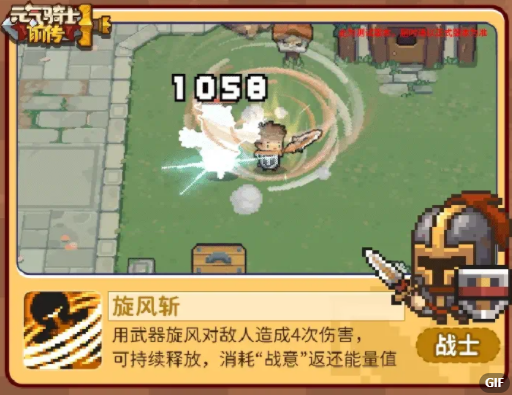 3。【旋风斩】:武器旋风对敌人造成4点伤害,可以持续释放,消耗“战意”可以返还能量值。