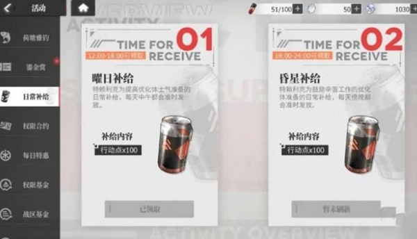 玩家可以在游戏过程中每天进行补充,分两次获得100行动点,时间分别为12:00~17:59和18:00~23:59。