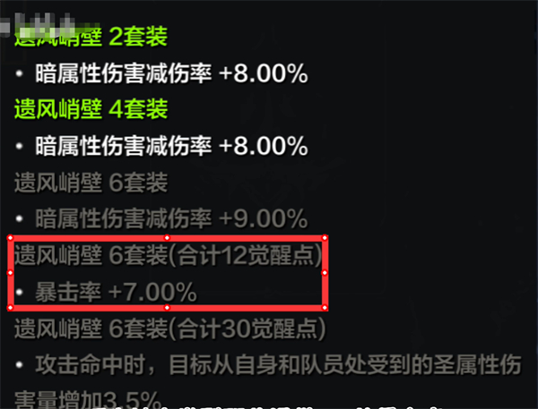 4。遗留悬崖6套装(共12点觉醒点),黑暗属性伤害减免率+7%