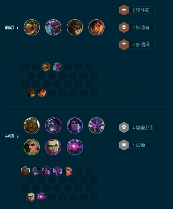 针对高费卡的主C阵容。一般为2-1升4、2-5升5、3-2升6、4-1/4-2升7。前期尽量使用坚固的棋子和羁绊进行工作,保证作品有2星,从而稳定血量和生命值。尝试利用兴趣升级,进入7、8阶段。7、8阶段将取代低成本工卡,转变为4-5费棋子的核心阵容。
