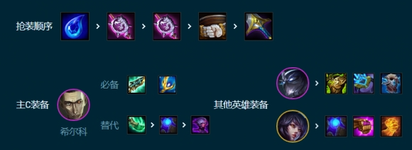 西尔科的科技枪和大天使之杖绝对是少不了的。恢复和法术强度叠加是核心。第三件可以作为青龙剑恢复法力,或者可以接受自适应头盔。慎的铠甲里面应该有离子火花,不然就应该给后排做一把电刀,降低魔抗。后期,多余的产量给阿狸,多余的肉给基桑蒂。