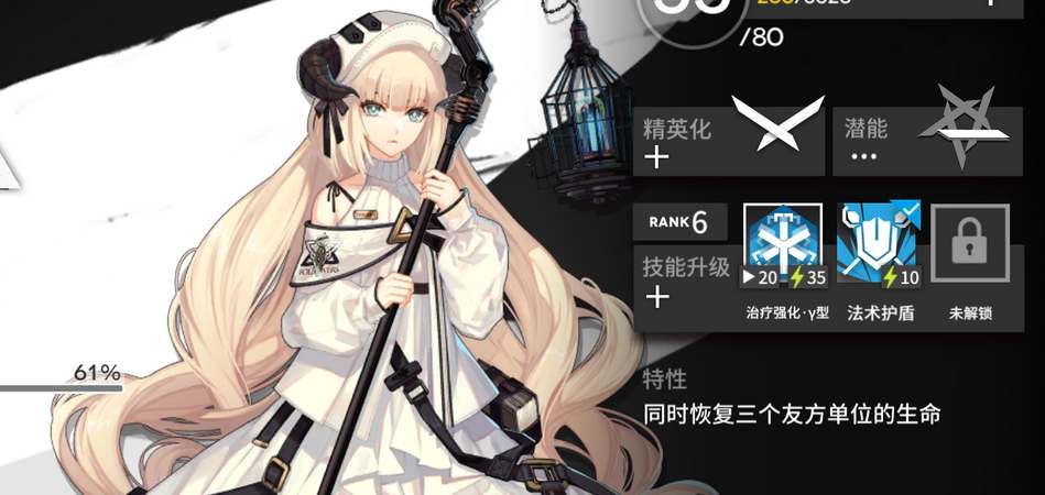 1.南丁格尔:六星医疗职业团疗师分部的干员。他不仅可以恢复队友的血量,而且还可以造成大量的伤害。他综合能力很强,广泛运用于各个级别的阵容中。