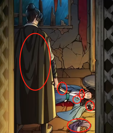 1。我们可以看到凶手穿着斗篷,拿着带血的刀。