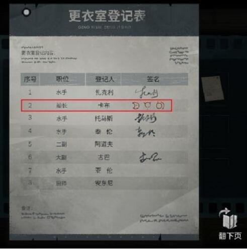 2。在更衣室登记表中找到三个卡布队长签名的符号。