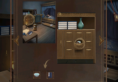 5。将两张叶子扑克牌放在柜台右侧的机关盒上,完成相同扑克牌的翻动,打开机关盒获得一袋铜钱。