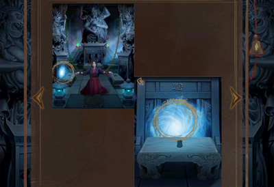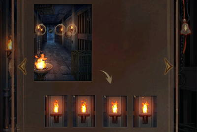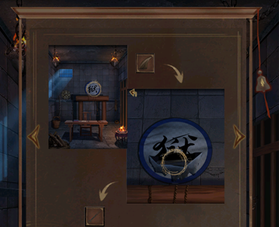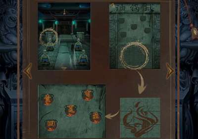 2。点击场景左侧的石墙,翻转下方的火焰图案,观察上方五个油锅的位置和出现的文字。