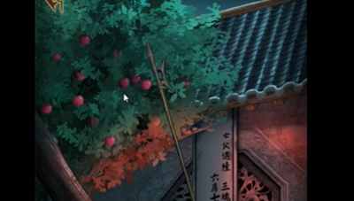 3。从柜子里拿出一个空酒壶和一个五神娃娃,来到门外用纸戟击倒树上的果子,得到紫色的果子。