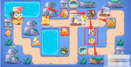 2。一开始,在图中所示的位置建造一个保龄球和多个箭头,以清除障碍和怪物。