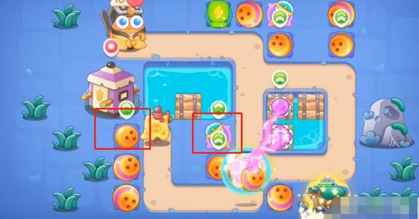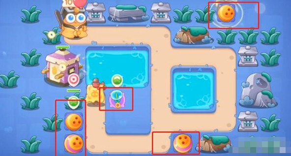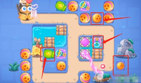 1。首先在如图所示的几个位置搭建保龄球,同时清除障碍物,中间搭建一个泡泡塔。