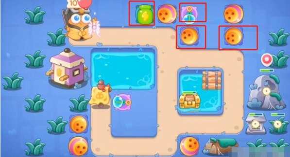 6。第六波,地图中央的瓶炮升满级,右上角加一个保龄球。