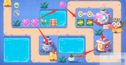 4。同时,继续在地图上添加鱼骨。可以在怪口放注射器来减缓敌人,升级所有电池。
