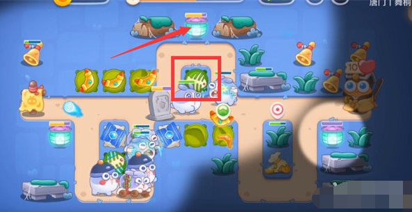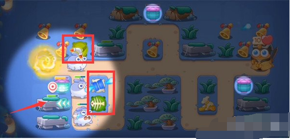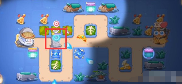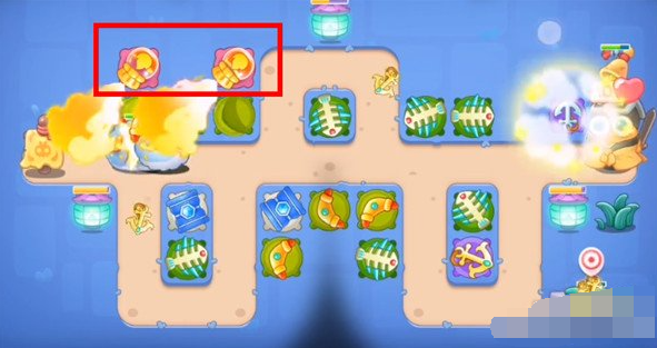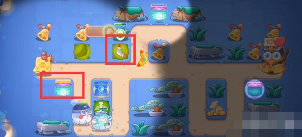 1。第一步:我们现在如图放置鱼刺和回旋镖,然后激活上面的障碍物,然后放置冰桶。