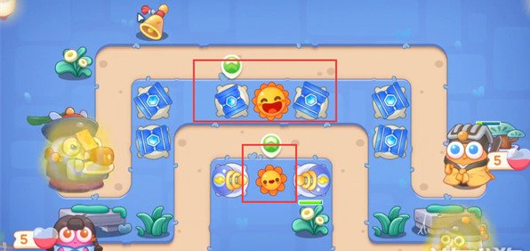 1。首先,我们需要在图中所示的位置建造两个冰桶来清理怪物和障碍物。