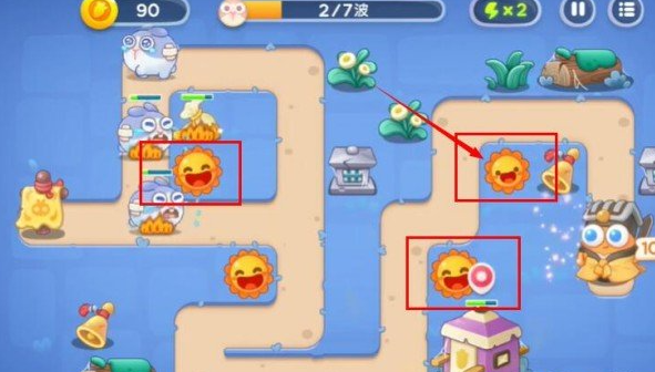 2。第一波结束的时候可以升级右边的太阳花加快清理道具,然后再放一个太阳花加快清理效率。