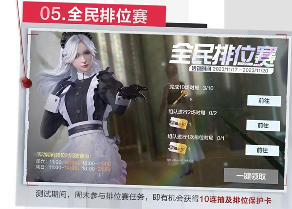 5。玩家可以在游戏中参加排位赛,获得连续10次抽排位保护卡。