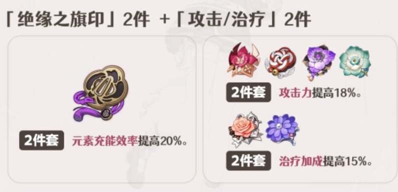 2.2隔热旗印+2攻击或治疗:这个2+2搭配方案比较容易成型,通用性很高,可以优化元素爆发周期的流畅度,还可以增加元素的治疗量元素爆发。