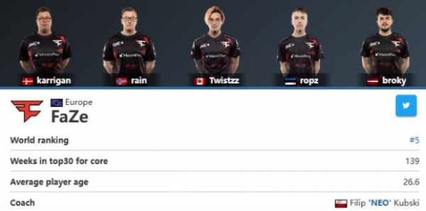 团队成员有:karrigan、Rain、twsitzz、ropz和broky