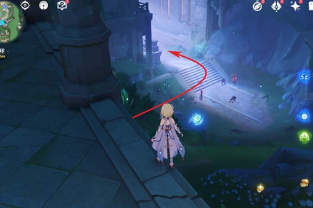 3。然后来到北边的废墟,顺着图中红色箭头的方向,控制水晶向机关发射光束开门。