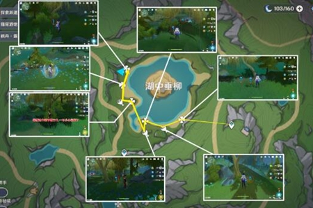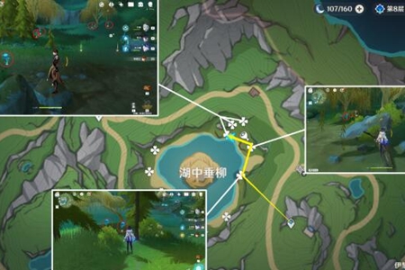 当你来到如图所示的位置,你可以在湖中央的柳树下和地图上标注的位置挑9。