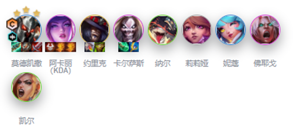 所需球员:莫德·凯撒、暗影之拳(kda)、约里克、卡尔卡斯、娜儿、莉莉娅、妮可、佛·耶戈、凯尔