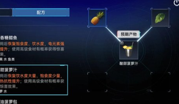 明星重启糖醋菠萝汁是游戏里的补充。玩家使用后可以获得大量的口渴感和一点饱腹感,也可以增加对炎热环境的抵抗力。很多玩家还不知道怎么做