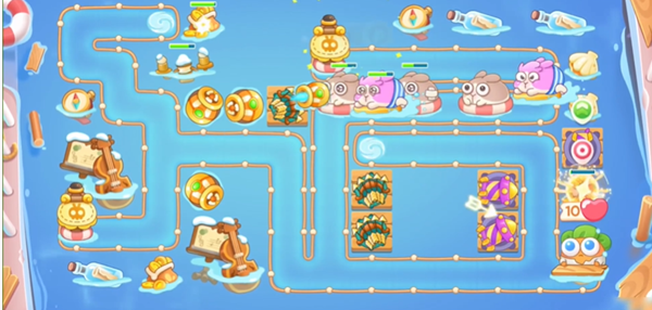 2。金币足够后,地图左侧会造四个鱼雷,萝卜周围会造火箭,防止遗漏怪物。