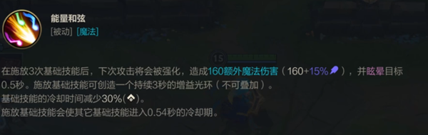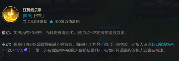 主动:打出一个缓慢向目标区域移动的音符阵,每0.75秒会传播一次声波,对敌人造成120点魔法伤害(120+15%)。