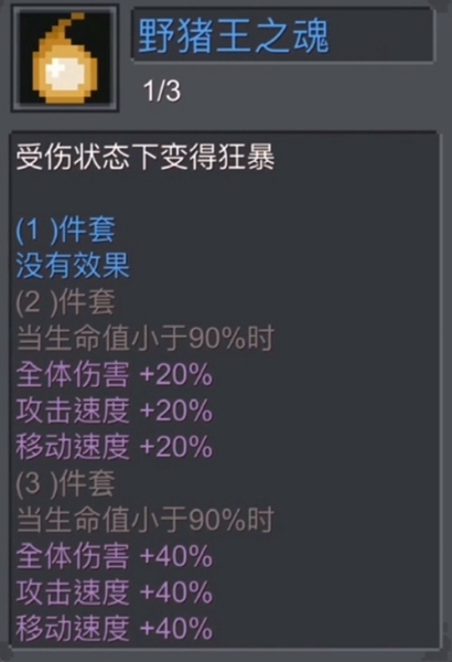 2。两件套或者三件套放在一起,可以激活野猪王的灵魂,增加全队的攻击速度和伤害。