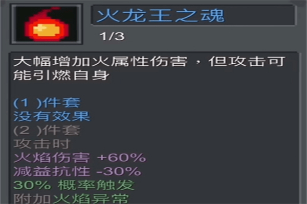 2。两件套会增加60%火焰伤害,减少-30%抗性,30%会触发火焰异常自燃。