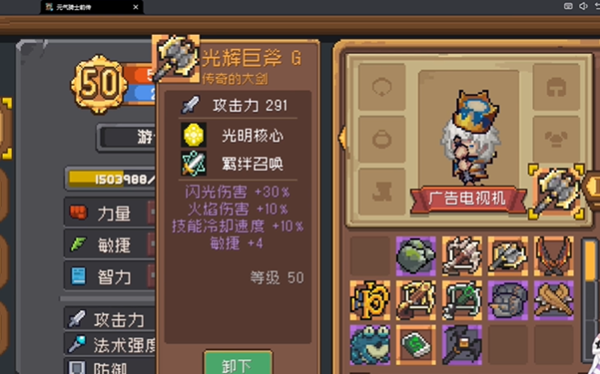 大力骑士的前传辉煌之斧,是一把传说中的武器。其50级基础攻击力达到291。同时也附带了两个羁绊,即轻芯和羁绊召唤。对于灵媒来说,它仍然