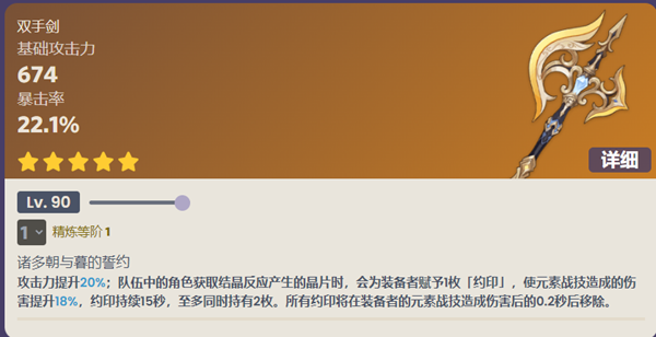 特效::攻击力提升20%;当队伍中的人物拿到产品反应产生的产品后,会给装备一个【合同!元素战伤害提升18%,最多同时持2件,持续15秒左右。所有契约封印将在装备元素战造成伤害后0.2秒移除。