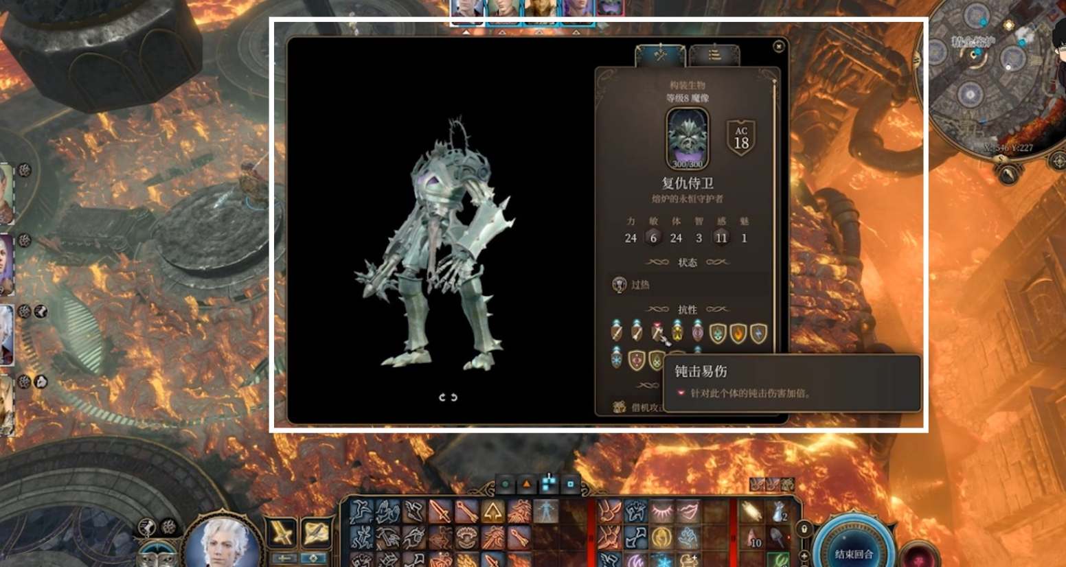 2.复仇卫士免疫雷霆,对钝器元素较弱。使用命令法术将其吸引至坩埚,使用伤害范围更高的恐吓攻击或缴械攻击,自定义刺客的偷袭+副手攻击,然后正面输出。