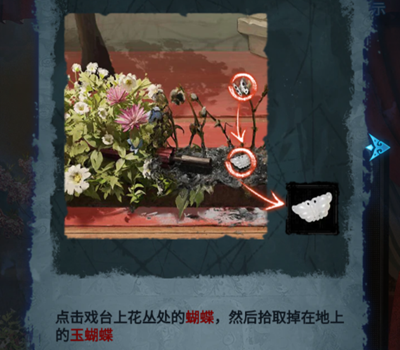 4。点击舞台上花朵上方的蝴蝶,点击掉落后得到玉蝴蝶,然后将玉蝴蝶放在梁山伯的墓碑上。
