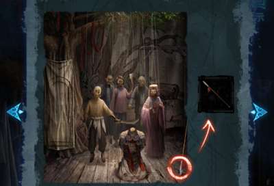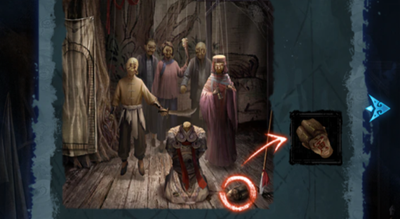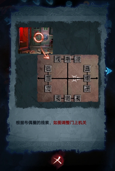 5。再次点击舞台上花丛中的纸伞,然后根据墓碑上的线索旋转图中所示位置的浮雕机制,打开即可获得绣花鞋。