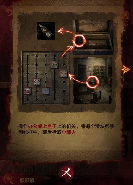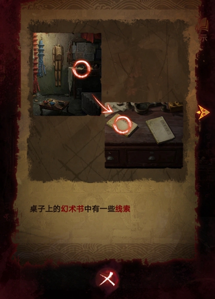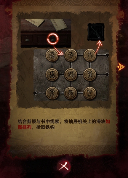 3。然后用钥匙进入前厅。桌子上的幻术书里有一些线索。结合剪报和书中的线索,如图排列抽屉机构上的滑块,拿起铁钩。