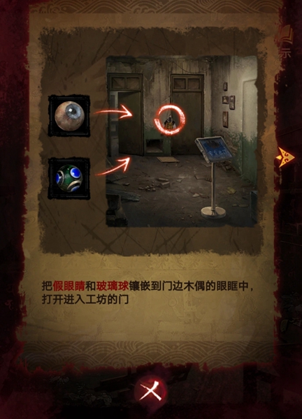 4。用书签打开通风口,将人造眼睛和玻璃球嵌入门边木偶的眼睛中,打开通往车间的门。