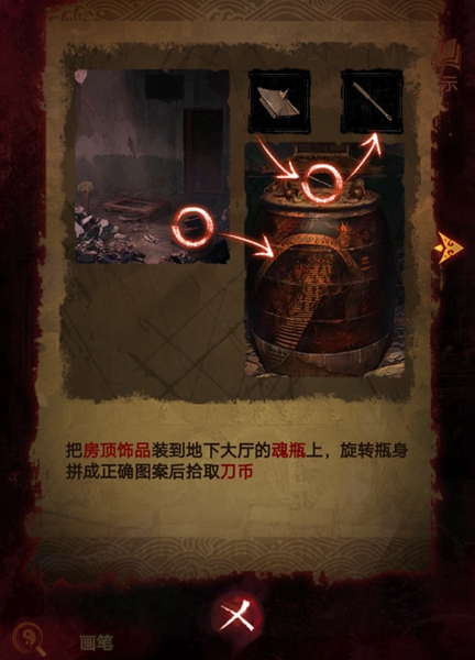 5。将屋顶饰品放在地下大厅的灵魂瓶上,旋转瓶身做出正确的图案,然后拿起刀币。