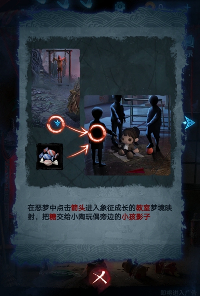 3。点击噩梦中的箭头进入象征成长的教室梦想地图,把糖给小陶娃娃旁边的孩子的影子。