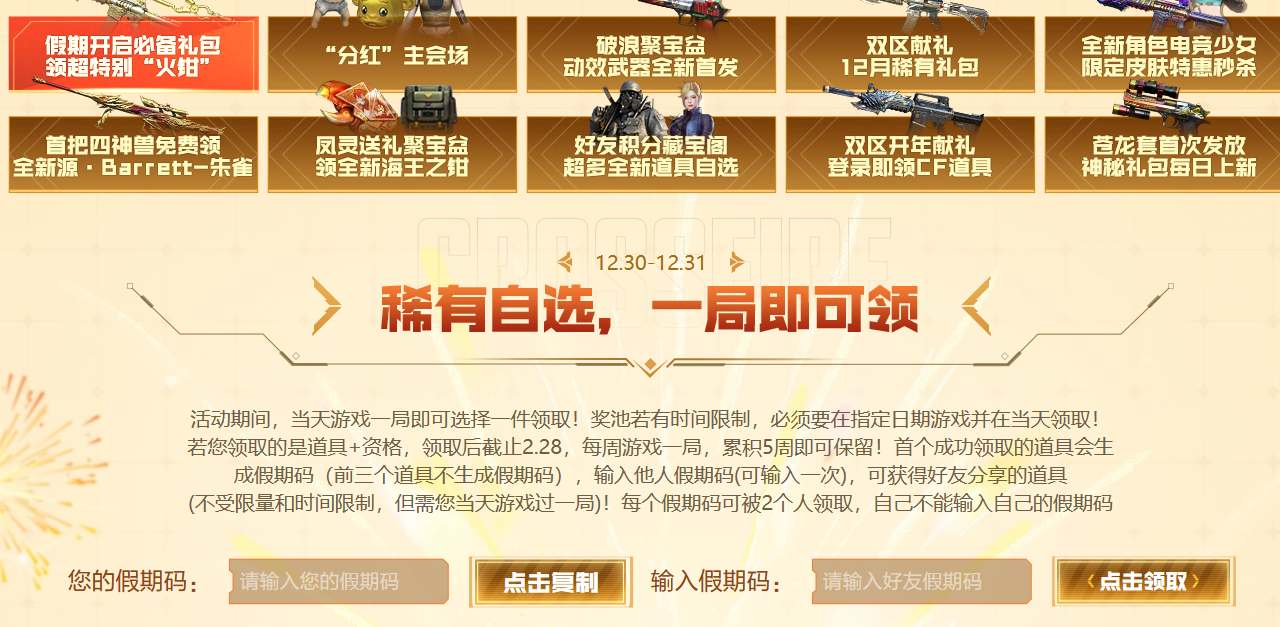 3.活动要求:活动期间,参与游戏的玩家可以从列表中选择稀有奖励,并获得相应的节日代码来领取奖励。需要注意的是,奖池只能在当天领取。如果错过了时间,就无法获得。