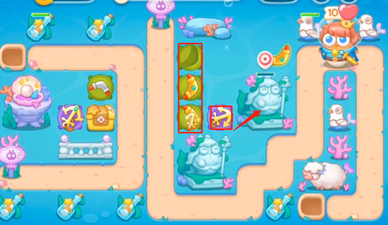你可以使用锚、雷达、回旋镖、毒针和冰冻之星来防御萝卜4海之女的13级。这一关有两个出口,还有很多道具。很多玩家都不知道女儿的13级是怎