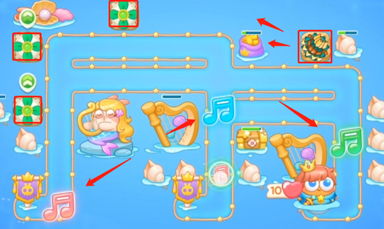 保卫萝卜4海之女,9级出现了一条美人鱼。美人鱼可以弹奏三个不同颜色的音符,并手动单击音符以合成相同的颜色。每种颜色都带来不同的增益。绿色笔记可以加速电池,蓝色笔记可以冻结怪物,而红色笔记会对怪物造成伤害。
