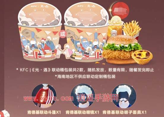 包含物品:肯德基联动斗篷、联动眼镜、联动胡须面具(兑换码),此外还可获得“温暖贴纸”双闪微印周边。