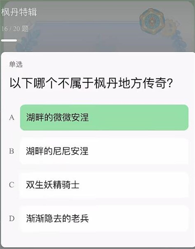 16. 以下哪项不属于当地的芳丹传说?答案:A. 薇薇安妮在湖边。