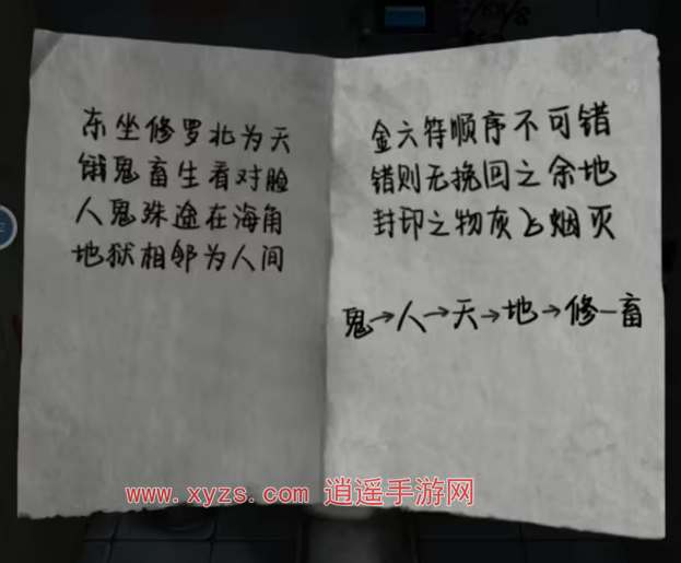 5、按照音符的顺序【鬼-人-天-地-修-动物】,对应厕所的六扇门。对应的顺序是【左下角-右上角-左中角-右中角-左上角-右下角】